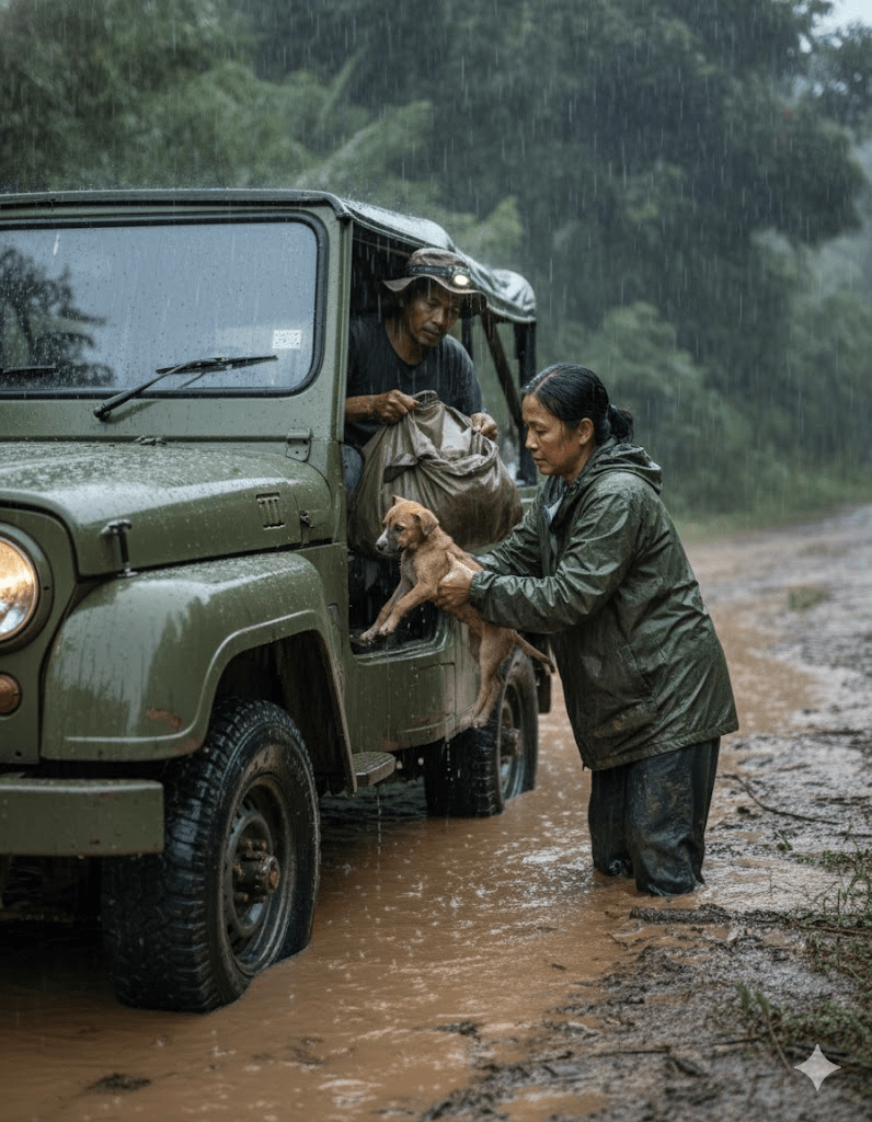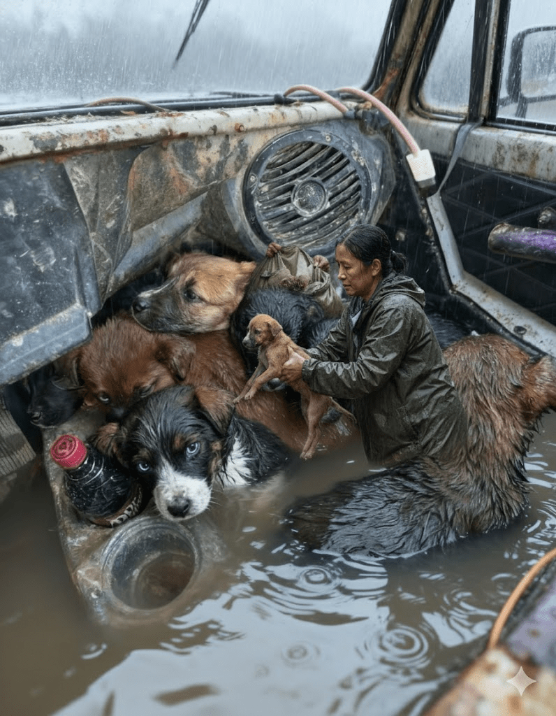 The monsoon season in Southeast Asia is a force of nature, transforming landscapes and testing the resilience of all who inhabit them. For Dr. Anya Sharma, a veterinary relief worker specializing in disaster response, it was a familiar adversary. She had faced floods, mudslides, and countless logistical nightmares, but nothing could have prepared her for the sight that greeted her team on a routine assessment mission deep within the saturated Kalimantan region of Borneo. The rain had been relentless for days, turning dirt tracks into treacherous rivers and submerging vast swathes of forest. Their modified jeep, a workhorse against the elements, was pushing through waist-deep water when the call came in: “Possible animal distress, remote coordinates, looks like an abandoned vehicle.” Expecting a routine recovery of perhaps a stranded cow or a few displaced chickens, Anya and her co-driver, local guide Jaka, pressed on. What they found, however, was far from routine, a scene that would etch itself into their memories and ignite a desperate, high-stakes rescue operation against the backdrop of an unforgiving storm. The image before them was heartbreaking: a rusted, partially submerged vehicle, its interior transformed into a muddy, watery cradle for a litter of terrified, rain-soaked puppies, huddled together for warmth and survival, their eyes reflecting a desperate plea for salvation.